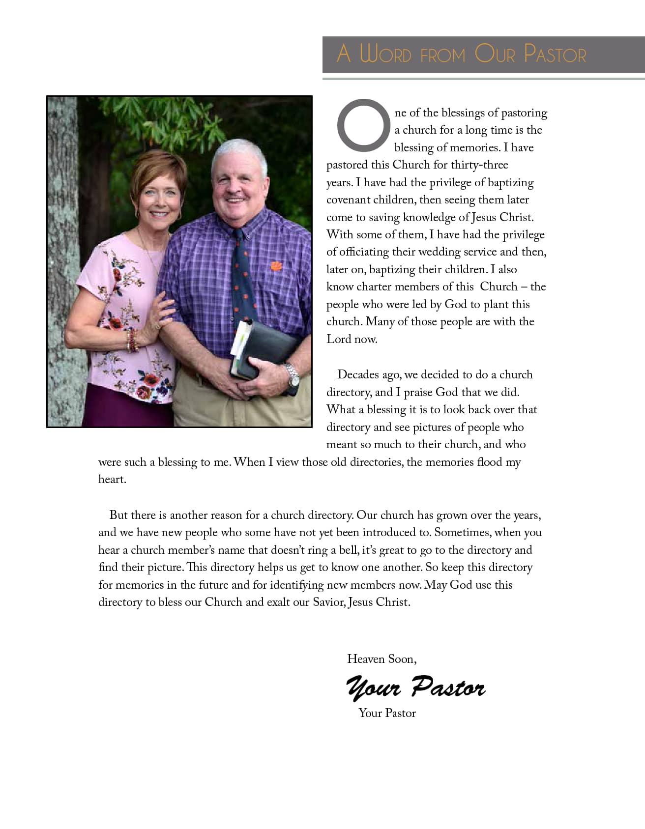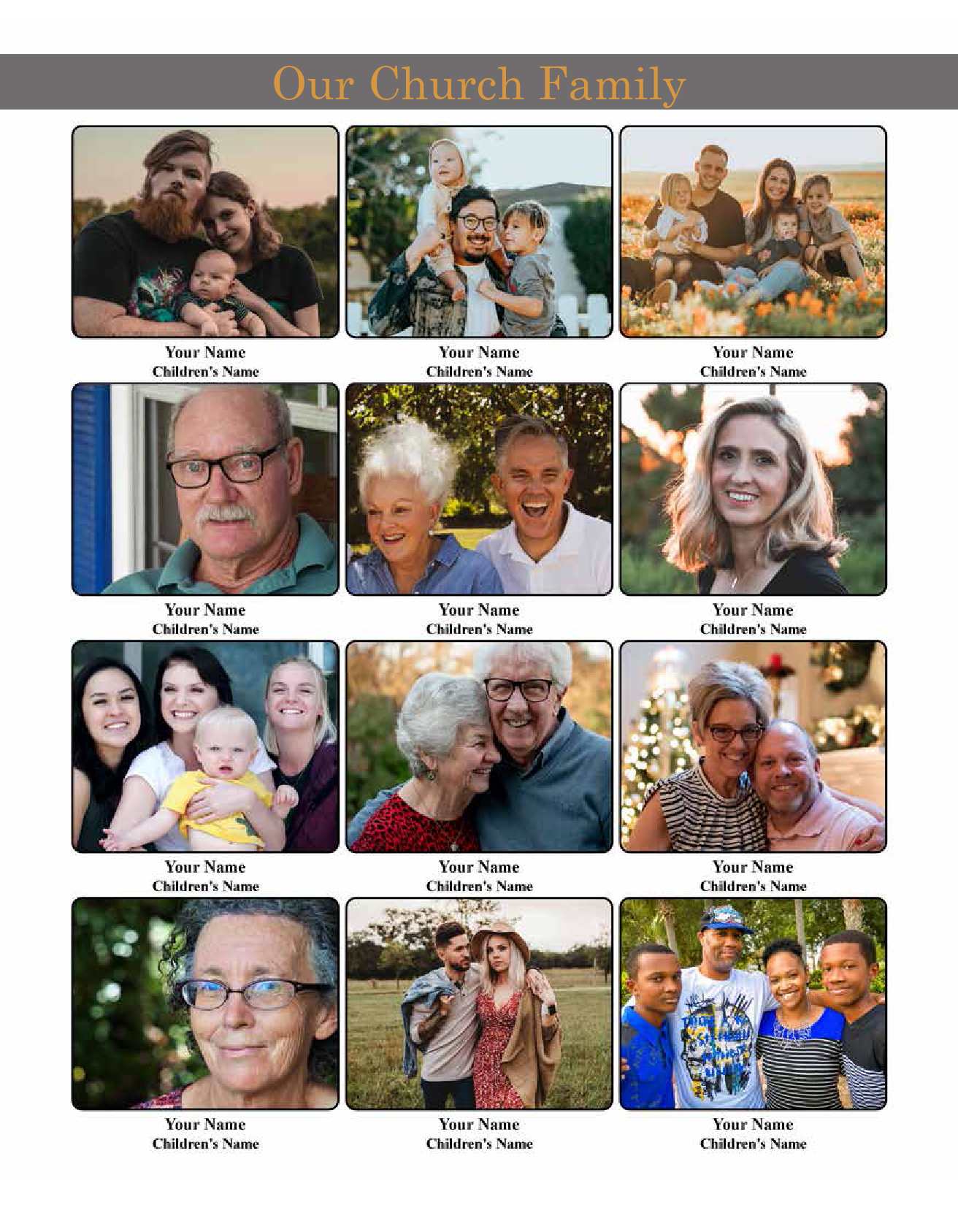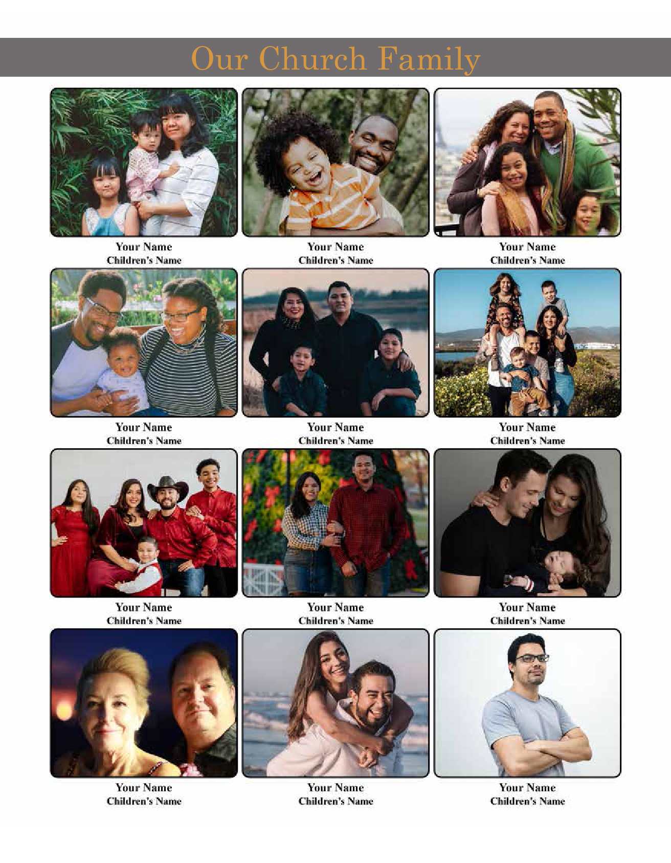 A church directory memorializes the life and history of a congregation by providing an enduring memory of each family enabling members to remember special occasions, anniversaries, mission trips, church staff, church activities and church history.